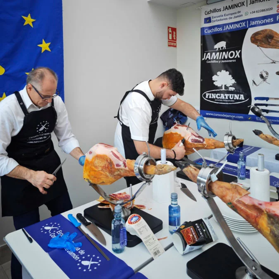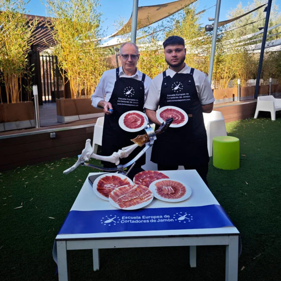 Juan José no solo se formó en la prestigiosa Escuela Europea de Cortadores de Jamón, sino que también ha perfeccionado su técnica trabajando en algunos de los eventos más exclusivos de la capital. Durante su formación, aprendió de maestros reconocidos, desarrollando habilidades que hoy lo destacan como un referente en el arte del corte de jamón.