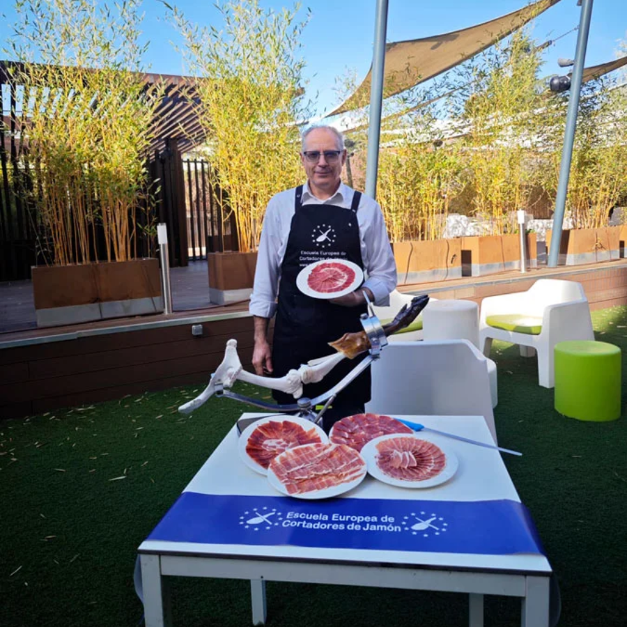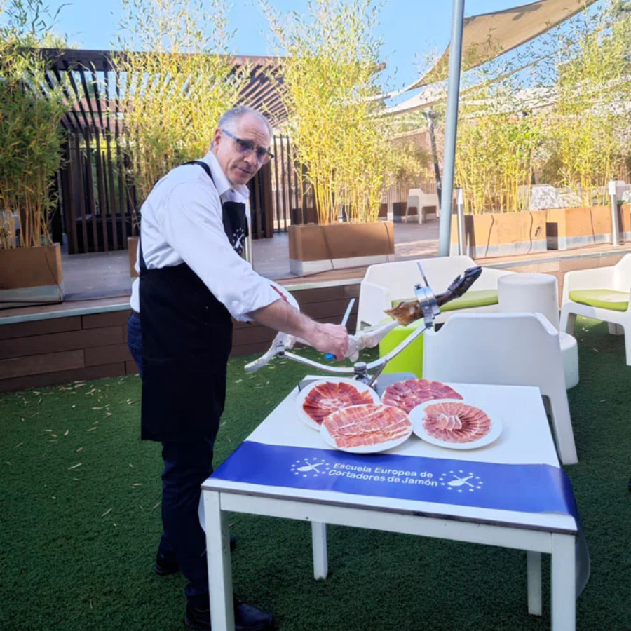 Ya sea un catering exclusivo, una boda en Madrid o una feria gastronómica, su habilidad para crear platos perfectamente cortados, su interacción profesional con los asistentes y su profundo conocimiento del jamón harán que cada momento sea especial.