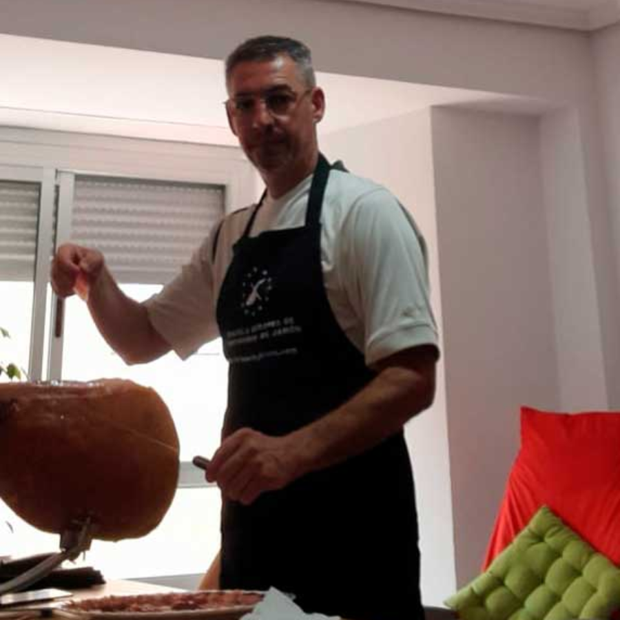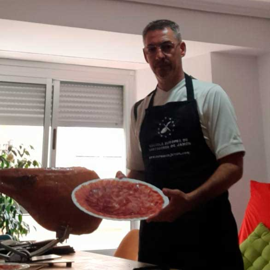 Julio Pla Martínez ha perfeccionado sus técnicas de corte en la reconocida Escuela Europea de Cortadores de Jamón. Esta formación le ha permitido dominar las habilidades necesarias para maximizar el aprovechamiento del jamón y presentar cada pieza con una estética impecable. Su destreza asegura que cada loncha sea perfecta, optimizando tanto el sabor como la presentación del jamón.