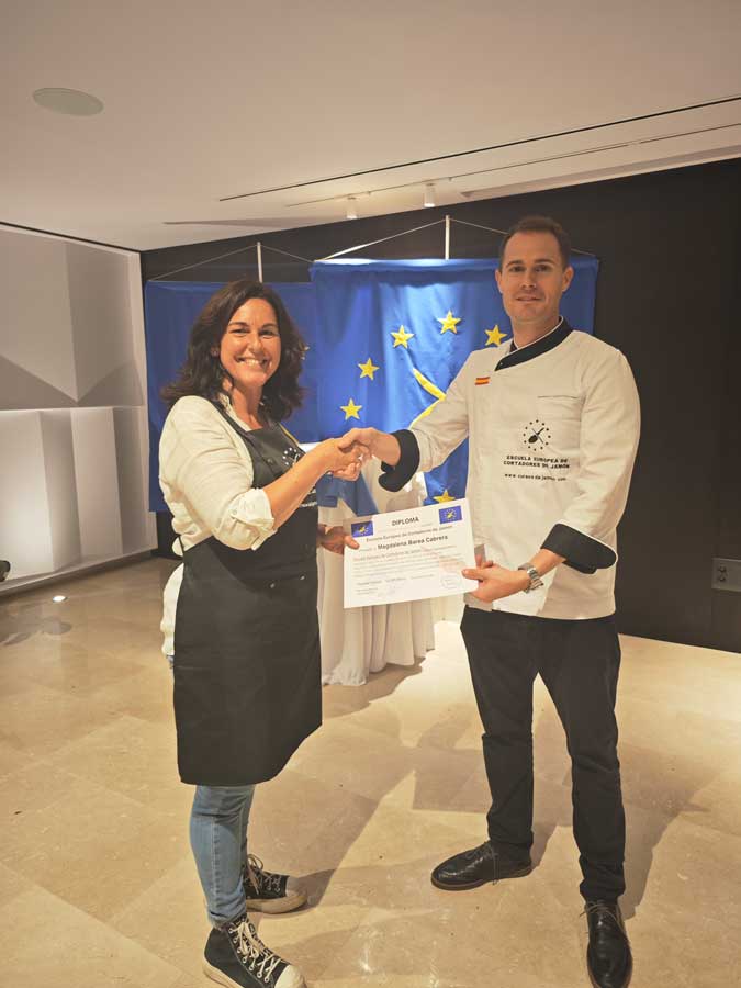 Magdalena Barea Cabrera se ha formado en la prestigiosa Escuela Europea de Cortadores de Jamón, donde ha aprendido las técnicas más avanzadas para asegurar que cada corte sea perfecto. Esta formación le permite destacar en el mundo de la gastronomía, ofreciendo una experiencia única y de alta calidad a sus clientes.